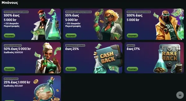 | Μπόνους Καλωσορίσματος | Έως €500 + 150 FS (Κατάθεση 1), έπειτα έως €500 + 50 FS (Κατάθεση 2), έπειτα έως €500 + 50 FS (Κατάθεση 3), ελάχ. κατάθεση €20, τζίρος 35x |